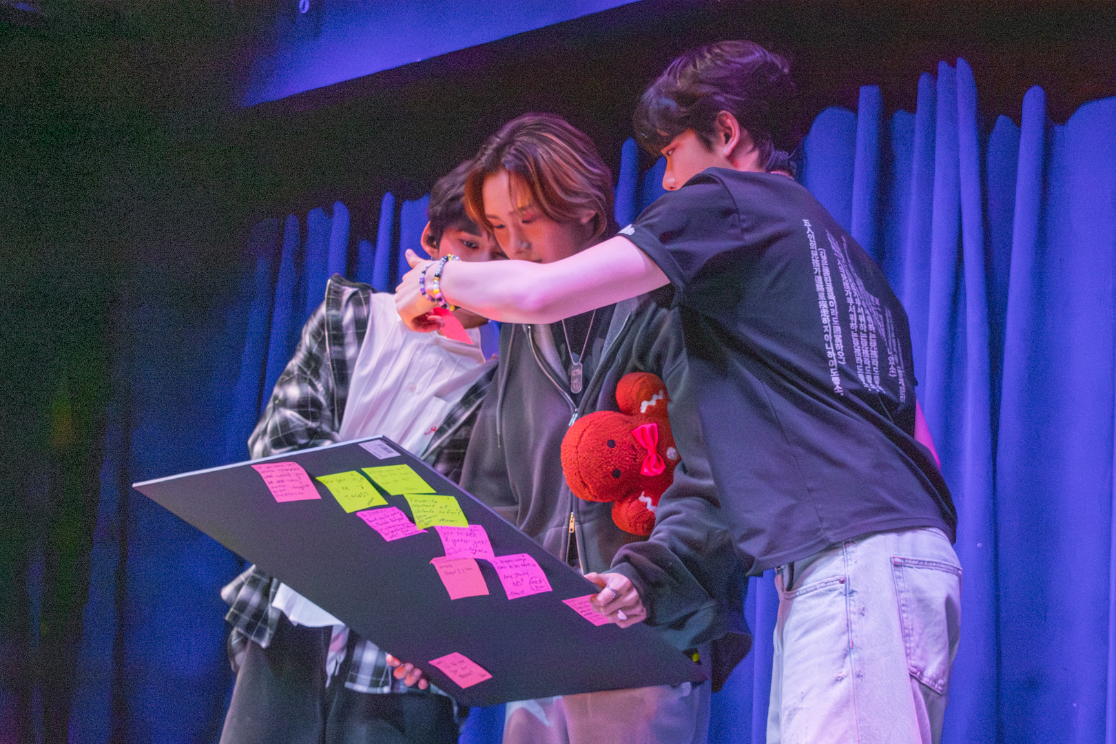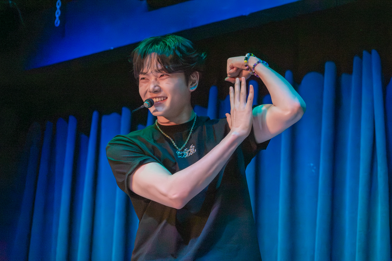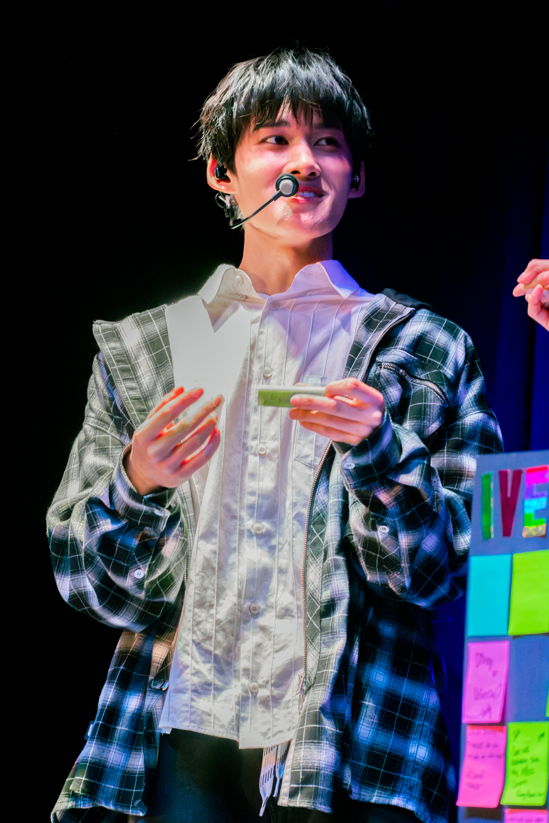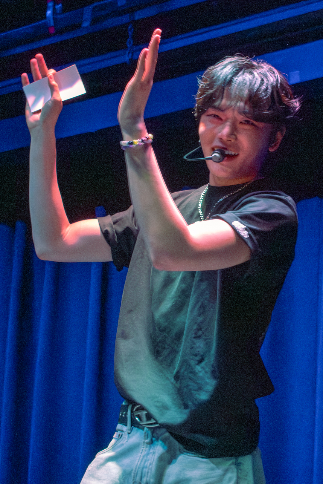 With this introduction finished, we moved into the Q&A segment. Kenny headed off stage to grab the board filled with questions written by 5TARZ themselves. The room was buzzing with everyone’s desire to possibly have their questions picked and read out by one of the members. Each member picked out questions that fit them the best. Some questions were inquiring about possible covers for later in the show, as well as some inside jokes between 1verse and 5TARZ. It was nice seeing how happy 5TARZ were as questions were read, joking and laughing with everyone in the room. The Q&A session almost turned into a massive conversation, with everyone feeling comfortable. Giggles could be heard from every corner of the room, and you could feel how loved the members were by all the 5TARZ attending that night. After the Q&A finished, the members announced that those whose questions got picked would be receiving a gift from a sponsor for the night–a local fashion brand called Hip Chic. This gift was given as a thank you to those who came out to attend the show. You could feel how appreciative everyone was, knowing that this show almost didn’t happen. Even fans who didn’t get their questions picked were hyping up those who did.