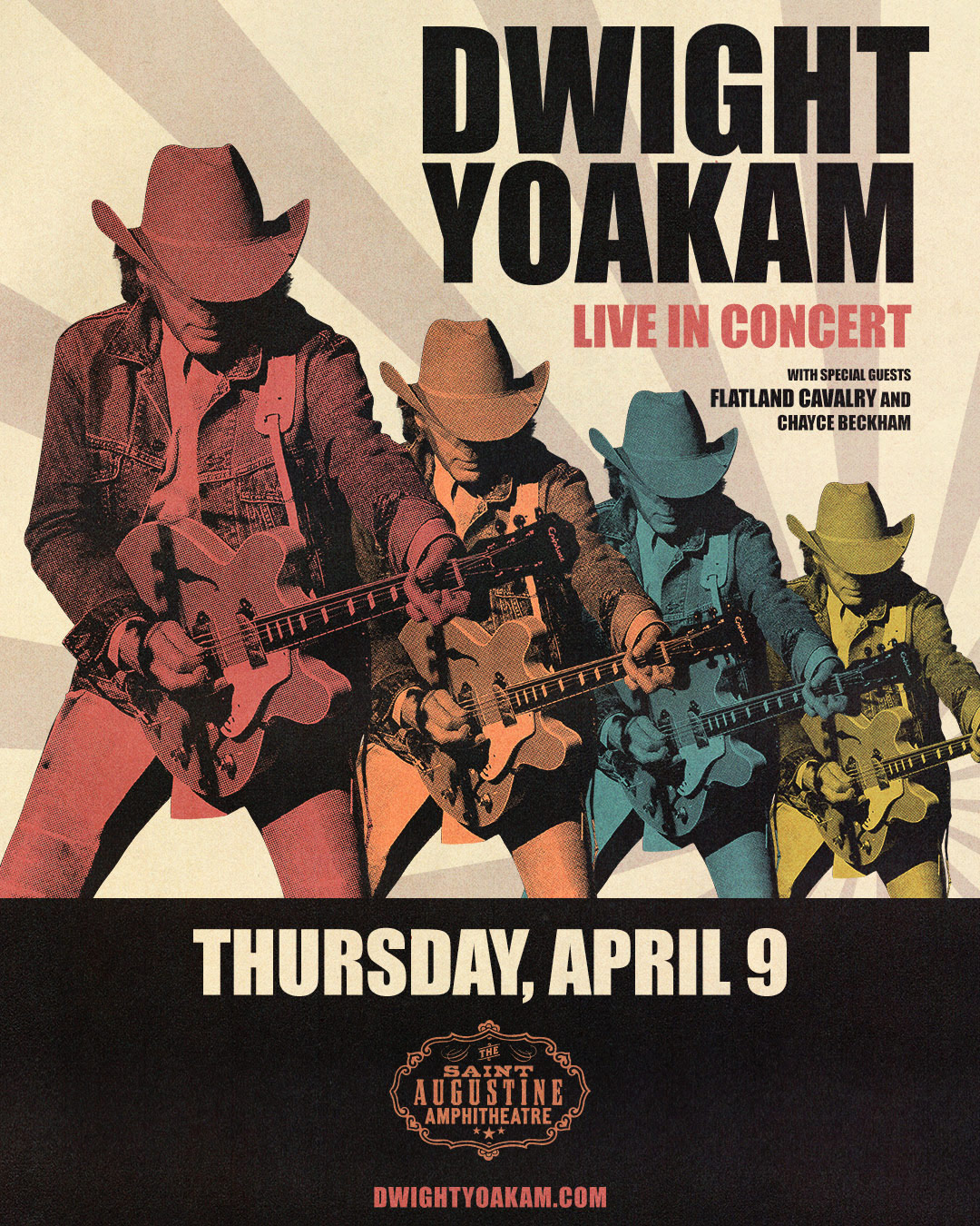 Dwight Yoakam remains one of country music’s most influential voices, with timeless hits like “Guitars, Cadillacs,” “Fast as You,” and “A Thousand Miles from Nowhere.” Known for his signature blend of Bakersfield twang and rockabilly edge, his live shows are packed with decades of classics. Joining him are Texas favorites Flatland Cavalry, whose heartfelt storytelling and Red Dirt sound have built a devoted following, along with American Idol winner Chayce Beckham, whose gritty vocals and modern country style round out this dynamic lineup. Let’s go, St. Aug!