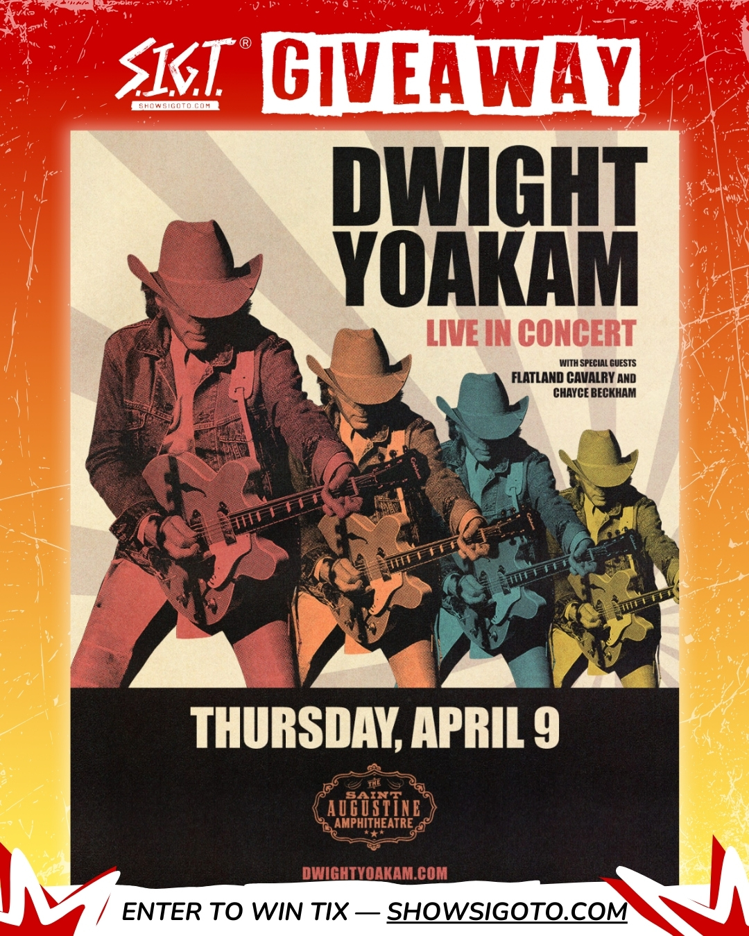 Don’t miss your chance to see Dwight Yoakam, Flatland Cavalry, and Chayce Beckham live at The Amp on April 9. Enter below for your shot at free tickets, or grab yours today and get ready for a night filled with country anthems and unforgettable moments in St. Augustine. Enter to WIN TICKETS BELOW or SECURE TICKETS HERE!
